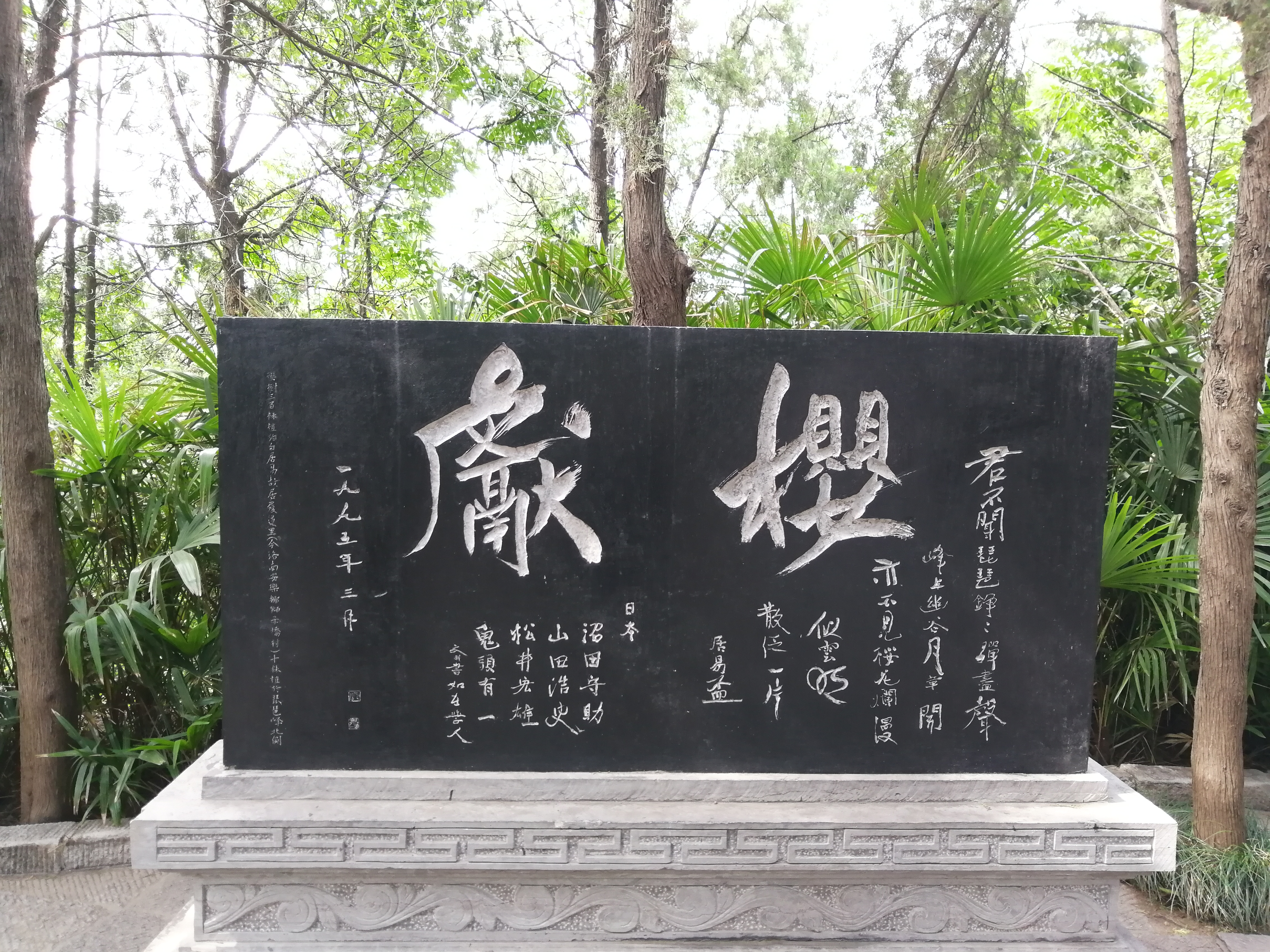 在游览完东山石窟之后,我们来到香山,拜访香山寺和白园。香山寺口的一副对联很有韵味:“乾坤容我静,名利任人忙。”一副对联尚有如此超凡脱俗之语,也就不难奇怪白居易为何把长眠之地选在香山。白园内的琵琶峰上绿意清幽,白池犹如水帘,我们在白公墓前久久瞻拜。墓旁有一巨石卧碑,刻有《醉吟先生传》,传中记醉吟先生咏怀诗一首,诗云:“抱琴荣启乐,醉酒刘伶达。放眼看青山,任头生白发。不知天地内,更得几年活?从此到终身,尽为闲日月。”如果读过他早年所作的《卖炭翁》、《上阳白发人》等新乐府,很难想象此种闲适诗出于白氏之口,但如果尝试去了解他坎坷的一生,必定对他晚年的释然多几分敬佩。可见在现实中难以遂意的人,如果常怀旷达之心,必然在精神世界享受着富足和安乐。卧碑旁有一日本石刻,名曰“献樱碑”,其上写道:“君不闻琵琶铮铮弹尽声,峰上幽谷月华开,亦不见樱花烂漫似云明,散泛一片居易杯。”可见对诗人的纪念是不分国界的,文化让我们在某种程度上超越彼此,共享同种情怀。