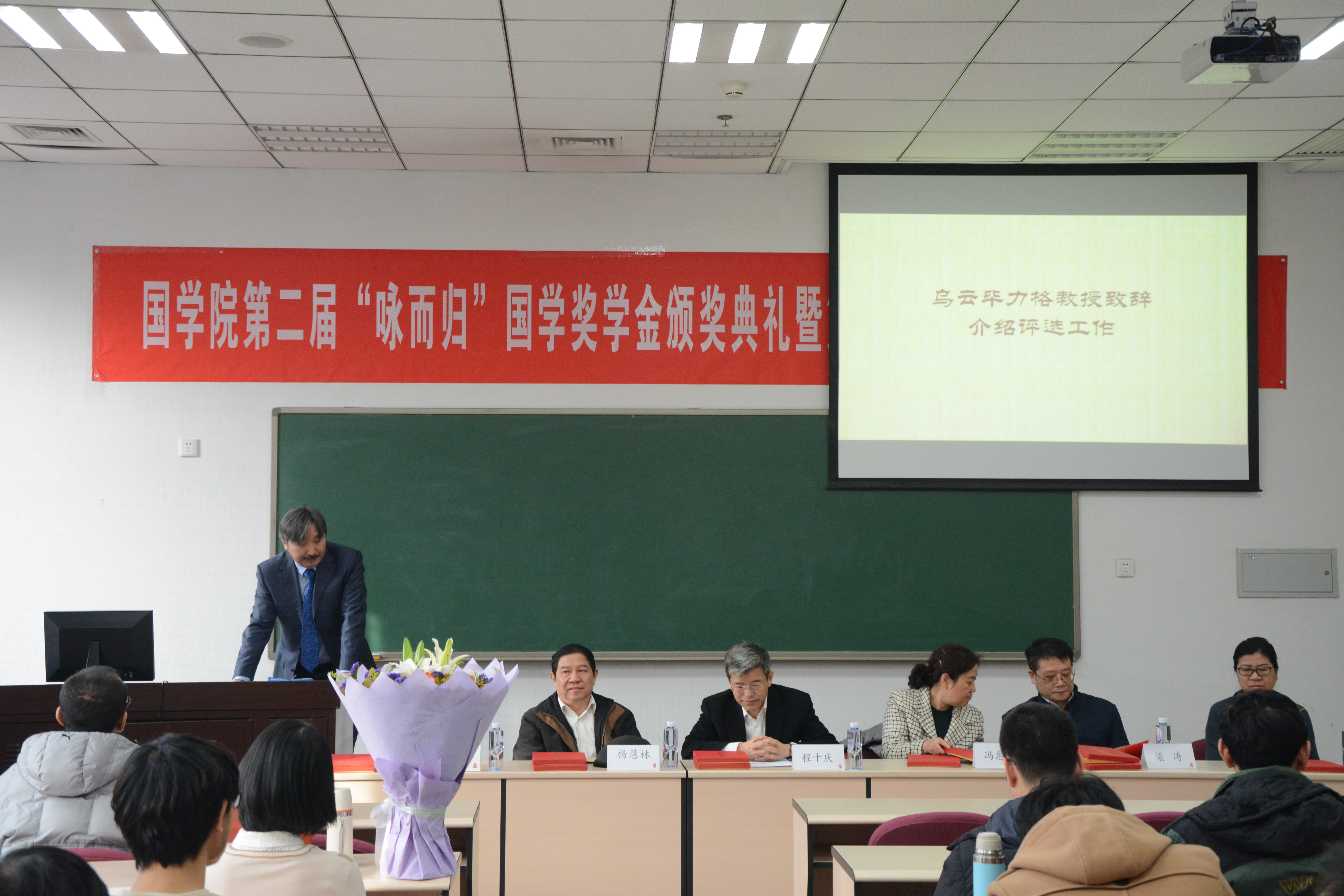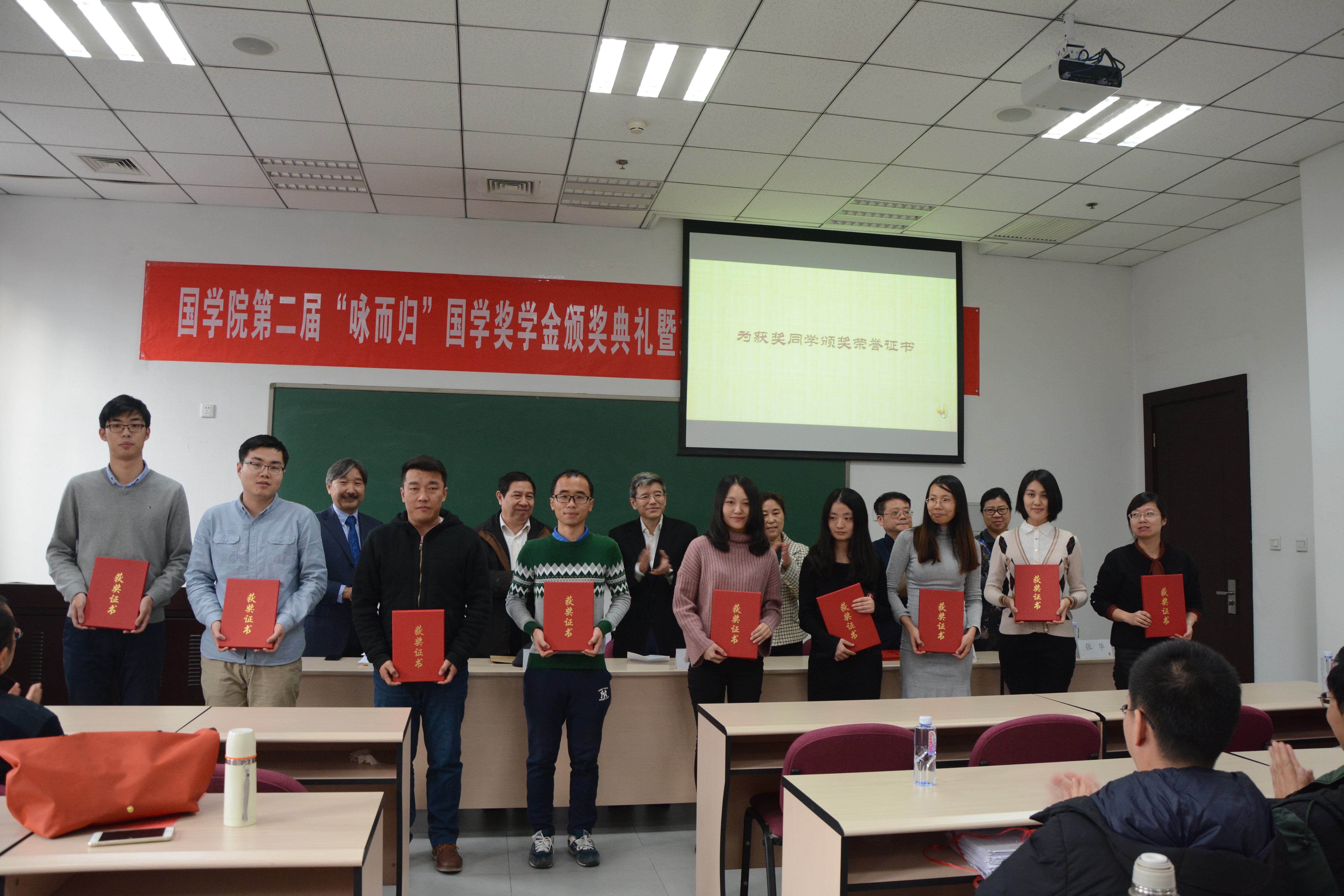 2016年12月9日14:00,麻豆做爱 第二届“咏而归”国学奖学金颁奖典礼在国学馆111教室正式举办。出席颁奖典礼的学校及学院领导包括:麻豆做爱 原常务副校长冯惠玲教授、麻豆做爱 原副校长、麻豆做爱 院长杨慧林教授、麻豆做爱 常务副院长乌云毕力格教授、麻豆做爱 副院长梁涛教授以及麻豆做爱 党委副书记张华。出席颁奖典礼的嘉宾是“咏而归”国学奖学金创办人程十庆先生。列席的麻豆做爱 教师代表包括:向世陵教授、索罗宁教授、孟宪实教授、韩星教授、陈壁生教授、华建光副教授、张瀚墨副教授、李萌昀副教授。颁奖典礼由乌云毕力格教授主持。