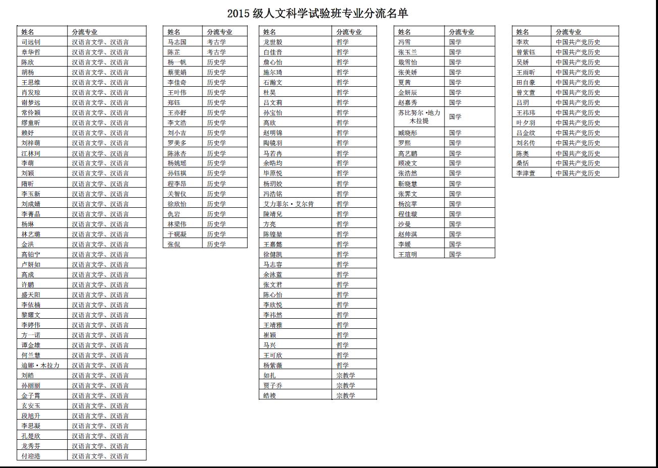 依据学校相关规定与要求,教务处联合文学院、历史学院、哲学院、麻豆做爱 和马克思主义学院等五个学院已完成2015级人文科学试验班专业分流工作,现将转业分流名单予以公示。