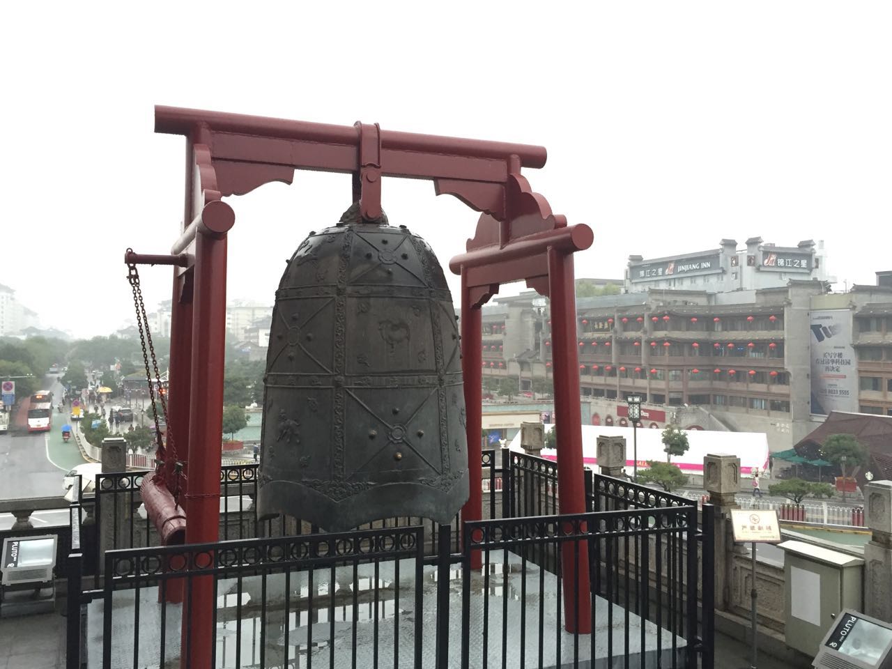 11月7日,天色灰蒙,略有细雨,天气微凉。我们一早抵达钟楼,购票后登上钟楼,因时间尚早,此时游客尚少,故得以细细观览。今日看钟楼位于西安市中心,明城墙内东西南北四条大街的交汇处,西北望去不远处就是与之呼应的鼓楼。据介绍,钟楼建在方型基座之上,为砖木结构,重楼三层檐,四角攒顶的形式,总高36米,占地面积1377平方米,是中国现存钟楼中形制最大、保存最完整的一座。里面正中布置有一套编钟,每日定时会有演出,只是我们来的时间尚早,所以未得欣赏,稍有遗憾。