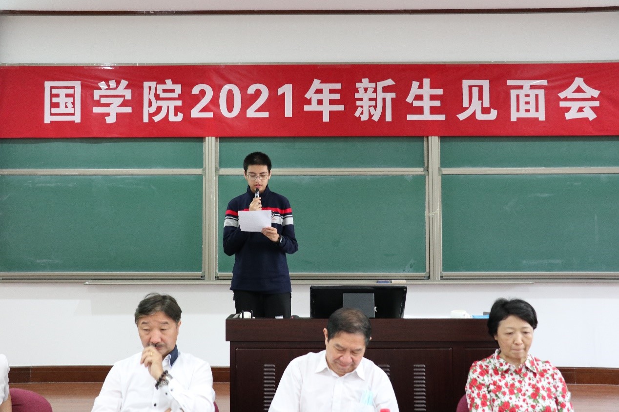 接着,本硕博三位新生代表依次发言。本科新生刘昱宏在发言中表示,虽然曾经是理科生,但国学一直是自己的信仰所在。他认为国学是一切潮流根基,能够引领时代的风向,并表示要与国学为伍,去找寻自己一生的道路。