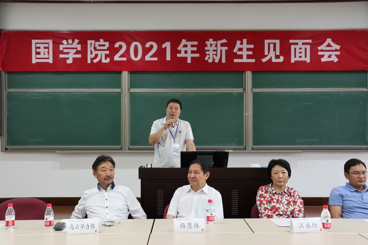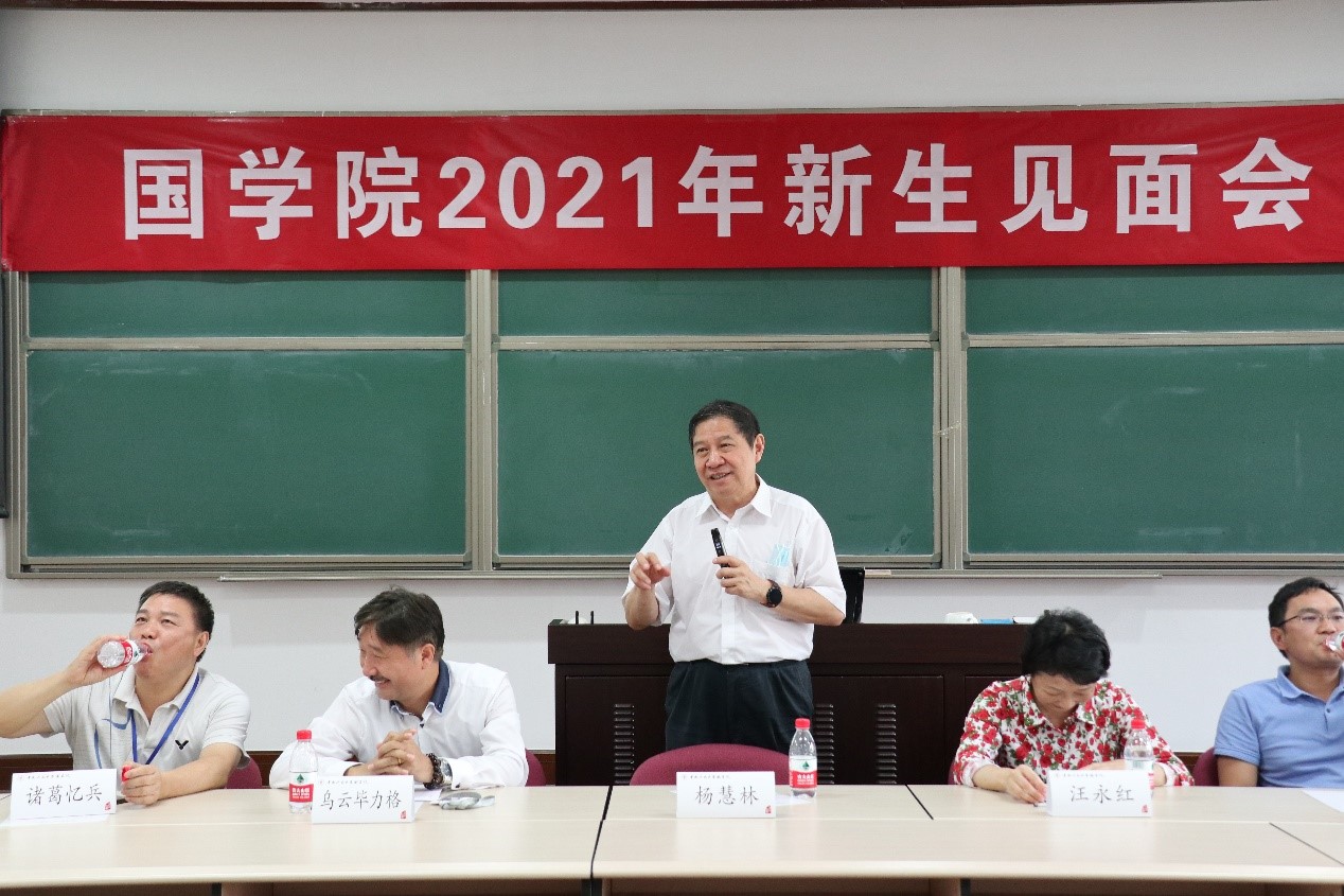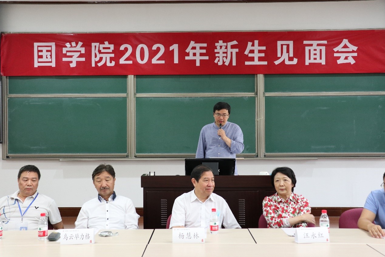 2021年9月11日上午9点,麻豆做爱 2021年新生见面会在国学馆228教室举行。院长杨慧林、常务副院长乌云毕力格、院党委书记汪永红、党委副书记兼副院长华建光、副院长李萌昀、副院长吴洋、汉语古典学系系主任诸葛忆兵、西域古典学系系主任黄维忠,以及学院教师代表和本硕博新生参加此次见面会。见面会由华建光主持。