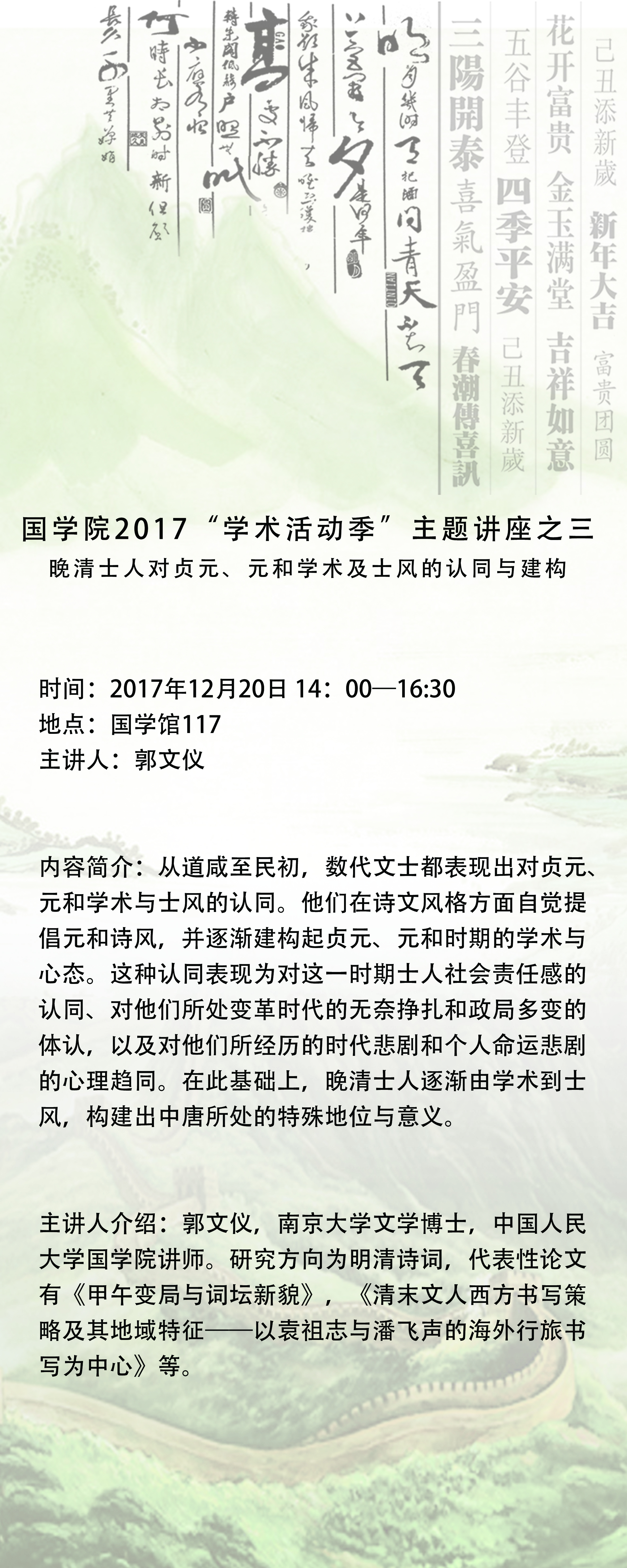 主讲人介绍:郭文仪,南京大学文学博士,麻豆做爱 讲师。研究方向为明清诗词,代表性论文有《甲午变局与词坛新貌》,《清末文人西方书写策略及其地域特征——以袁祖志与潘飞声的海外行旅书写为中心》等。