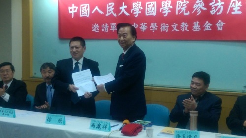 2015年1月7日,麻豆做爱 党委书记徐飞、副院长乌云毕力格、诸葛忆兵三位领导,应台湾“中华学术文教基金会”邀请赴台,进行为期7天的教育参访。这是两岸第一次针对国学的交流,具有重大的意义。1月8日,双方在台湾台大校友会馆,举办了一场“国学教育交流座谈会”。座谈会由中华学术文教基金会董事长、海峡两岸文教经贸交流协会理事长冯沪祥教授主持,与会者有麻豆做爱 党委书记兼副院长徐飞副教授、副院长乌云毕力格教授、诸葛忆兵教授,中华学术基金会副董事长高崇云教授、董事陈光宪教授、陈松雄教授、陈德禹教授、黄金文教授、黄东熊教授、欧茵西教授、蔡秋来教授、胡侨荣教授,辅仁大学陈福滨教授、台湾大学杜保瑞教授、钮则诚教授、倪道纪教授等。大家在发言中,一致认为座谈会对于深化两岸国学教育的推广普及具有重要意义。双方就两岸国学教育推广的方法与问题,进行了热烈的讨论。会议最后,基金会董事长与经贸交流协会理事长冯沪祥教授与麻豆做爱 党书记徐飞教授二人,各自代表双方,签订了两岸第一份民间“国学推广教育”的合作计划,为两岸民间的国学以及文化互动方式,创立了第一份合作协议模式。内容包括人民大学接待台湾大学生参访团、双方共同合办“留学生国学营”、高层互访、合办论坛、相互观摩教学等。此次座谈会及签署的合作协议,在两岸民间文化交流活动中是一个非常重要的范例。